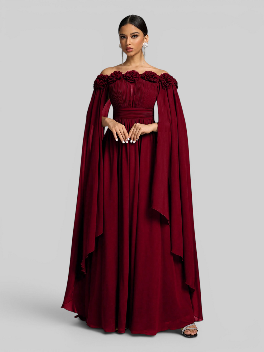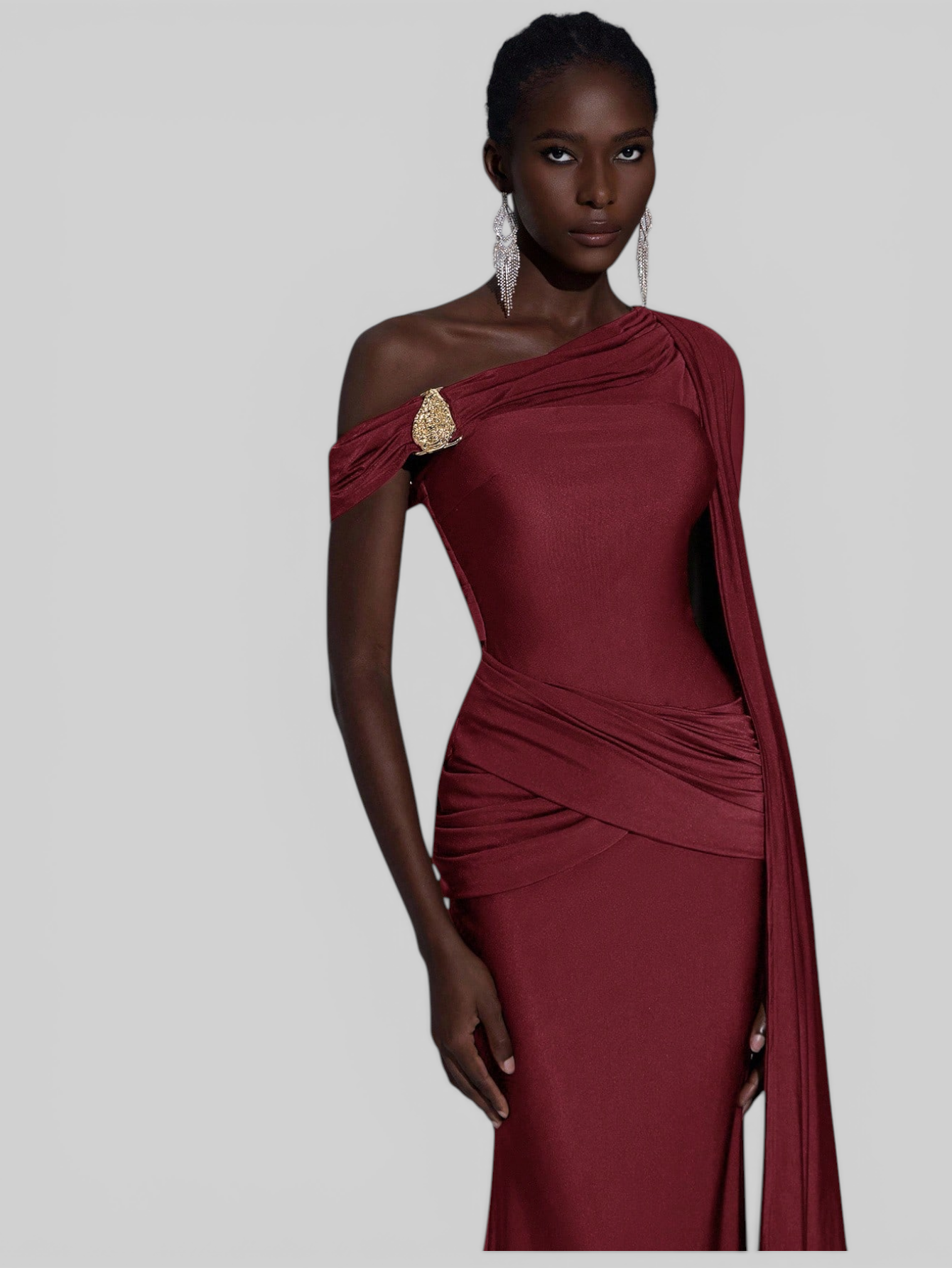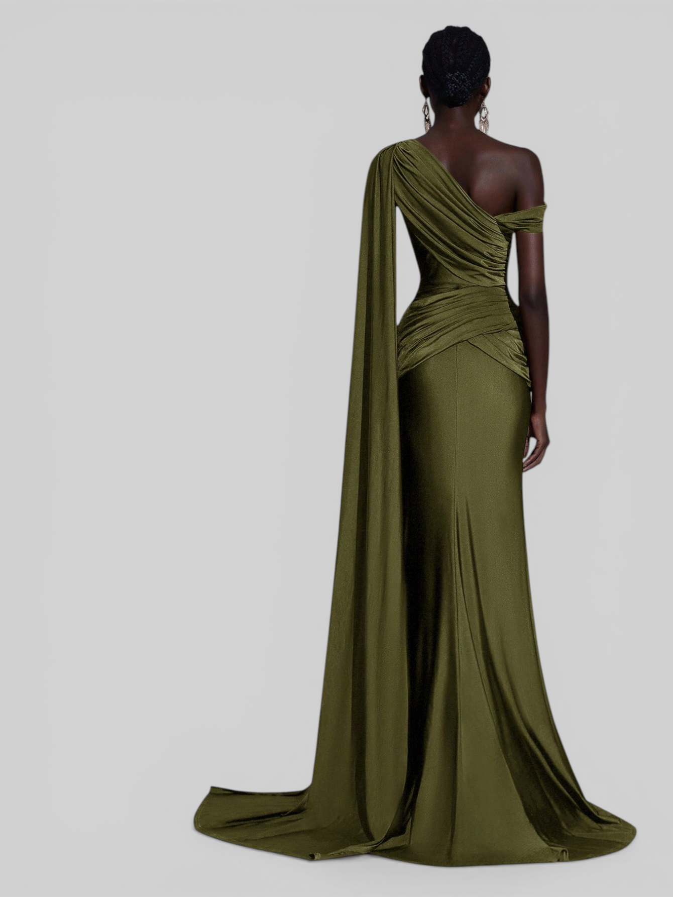 O modelo conta com um ombro só e uma capa fluida alongada, criando um visual impactante e refinado — perfeito para madrinha de casamento, eventos formais e celebrações de alto padrão.